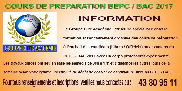 Le Groupe Elite Académie (G.E.A), structure spécialisée dans la formation et l’encadrement des candidats (Libres / Officiels) aux différents examens organise des cours de préparation à l’endroit des candidats aux examens du BEPC / BAC session 2017.