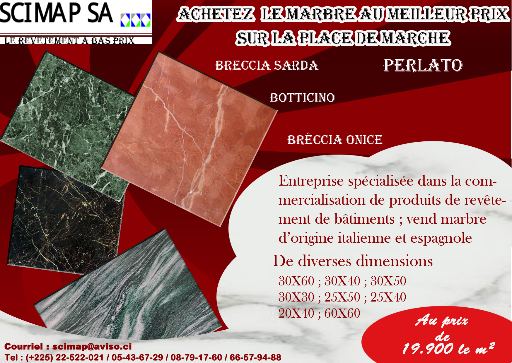 Entreprise spécialisée dans la commercialisation de produits de revêtements de bâtiments ; vend marbre d’origine italienne et espagnole appelé : -Botticino -Breccia sarda et bréccia onice -Perlato De diverses dimensions : 30X60 ; 30X40 ; 30X50 ; ...