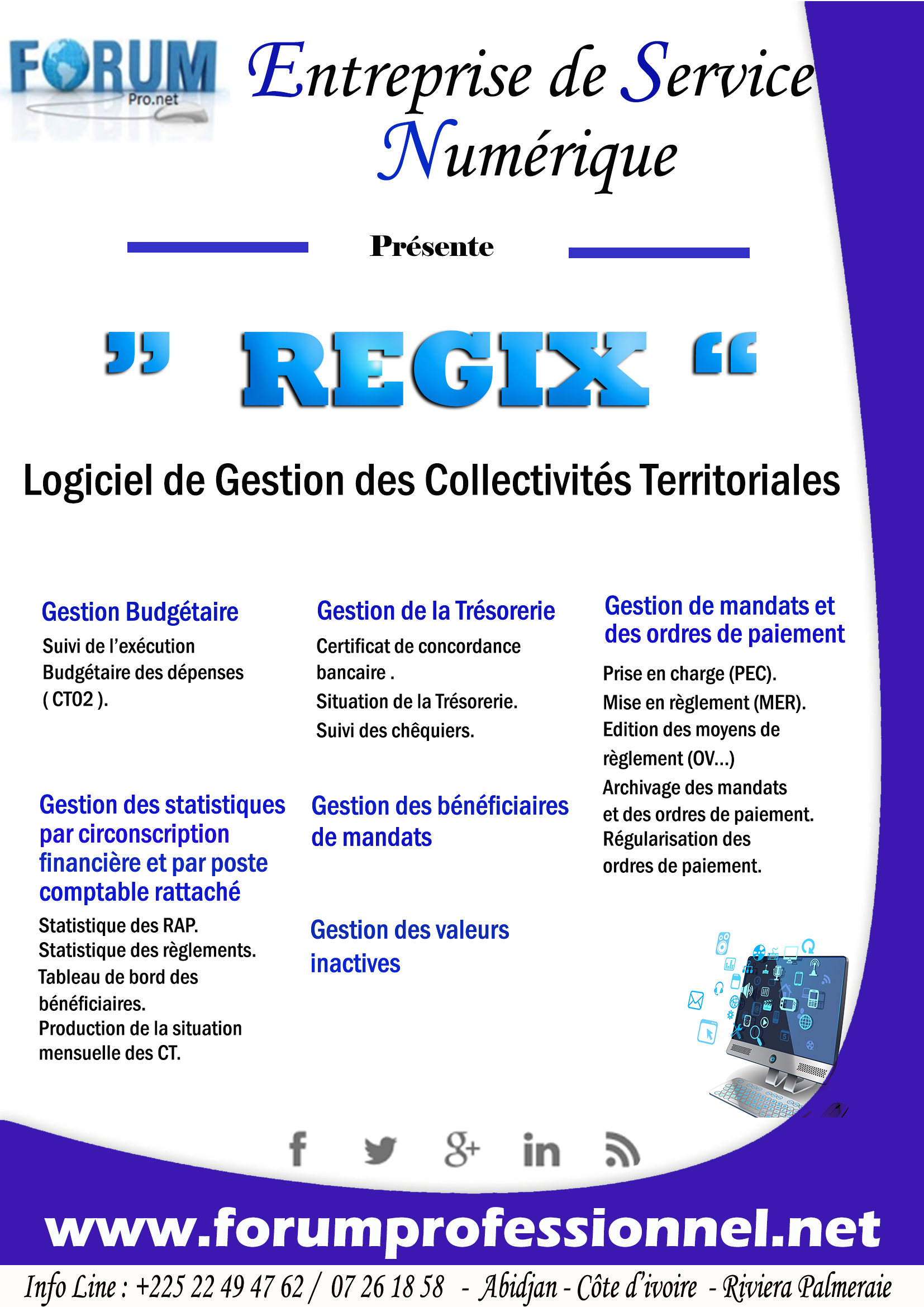 NOUVEAU!!! REGIX, LE SYSTEME INTEGRE DE GESTION DES COLLECTIVITES TERRITORIALES, DESORMAIS DISPONIBLE!!! La Gestion Budgetaire, la Trésorerie, les états statistiques.... Tout devient plus simple pour les administrateurs Publiques de Collectivités avec Le Système Intégré de G...