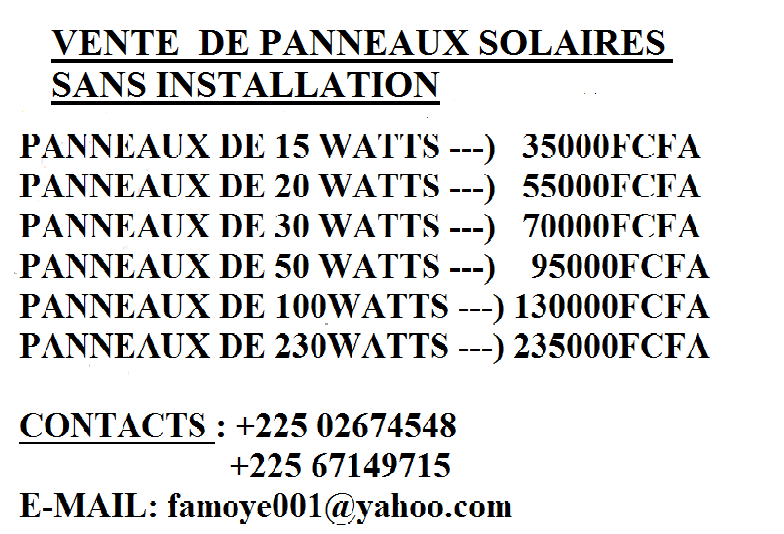 VENTE DE PANNEAUX SOLAIRES A DES PRIX DEFIANTS TOUTE CONCURRENCE.VEUILLEZ NOUS CONTACTER AU +225 02674548// +22565149715E-MAIL: famoye001@yahoo.com