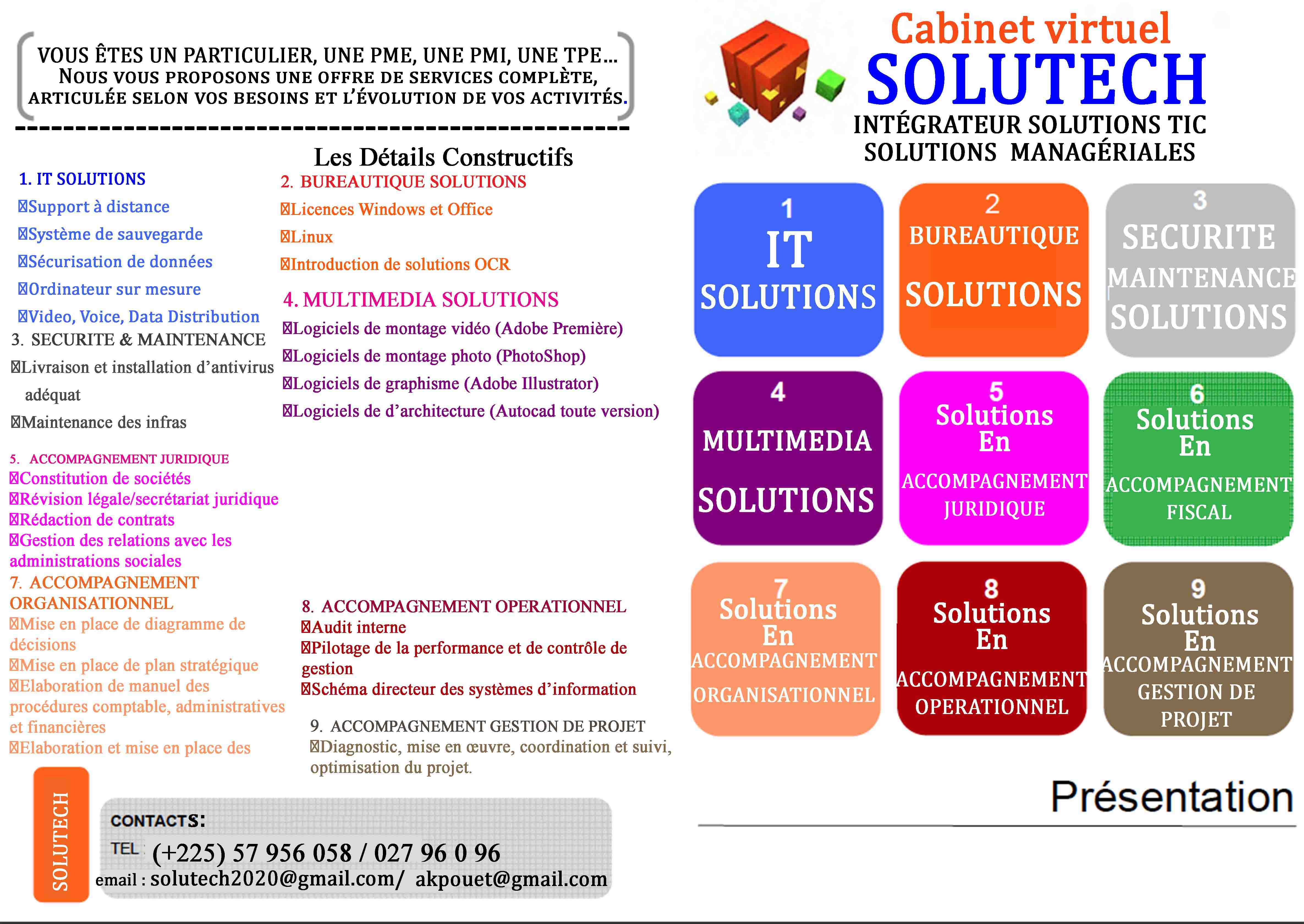 LANCEMENT D’UN NOUVEAU CABINET VIRTUEL DE SERVICES TIC ET MANAGÉRIAUX EN CÔTE D’IVOIRE Le modèle d’impartition novateur de « Solutech », un concept prometteur pour les entreprises. « L’actualité confirme qu’il est temps, pour le secteur TIC et Managérial en Côte d’Ivoire, ...