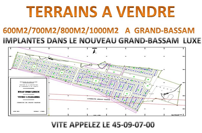 TERRAINS TRES PRISES DISPONIBLES A GRAND-BASSAM..........VOUS DESIREZ ETRE DANS LE JOYAUX .DANS LE NOUVEAU GRAND-BASSAM DERRIERE LES ROSIERS .PRES DE LA PRESTIGE UNIVERSITE AMERICAINE NON LOI DE L AUTOROUTE ET DE LA ZONE FRANCHE .NE TARDEZ PAS LES TERRAINS SONT DE 600...