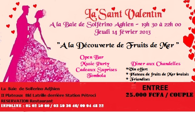 La Baie de Solférino Aghien organise « La saint Valentin » le Jeudi 14 février 2013. Thème : "A la Découverte de Fruits de Mer"...