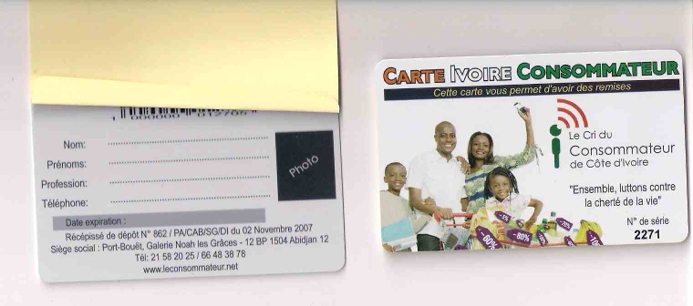 Bonne nouvelle pour tout les consommateurs de Cote d'Ivoire. L'ONG Le Cri du Consommateur met a votre disposition la carte Ivoire Consommateur afin de reduire vos depenses. Avec cette carte vous avez droit a des reductions dans plus de 400 commerces et services. Partant des sup...