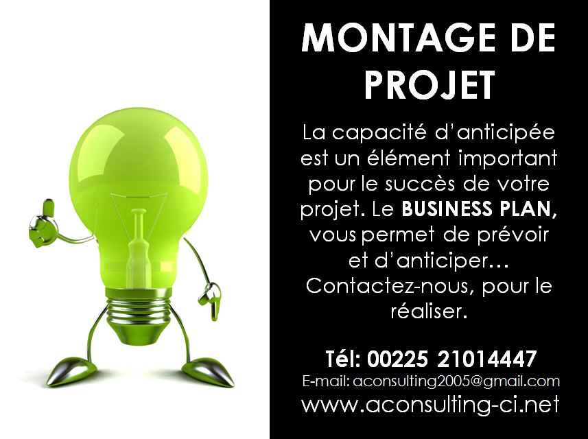 Pour la réalisation de votre business plan, bilan comptable, tableau de bord de gestion...contactez-nous. Une équipe d'experts se tient à votre disposition. Tél: 2101 4447 / 5454 3440 E-mail: aconsulting2005@gmail.com wwww.aconsulting-ci.net