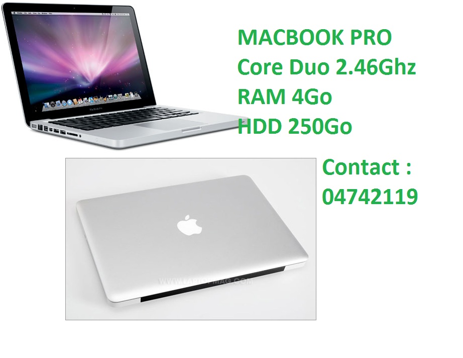 VENTE RAPIDE MACBOOK PRO, Core Duo, Très propre Intel Core 2X2.46Ghz, RAM 4Go, HDD 250Go, wifi, webcam, lecteur DVDRW Prix 390.000f APPEL VITE : 09984484// 04742119// 41330935 Et viens te joindre au plus grand groupe de vente et d'achat de PC. http://www.facebook.com/groups/VENT...