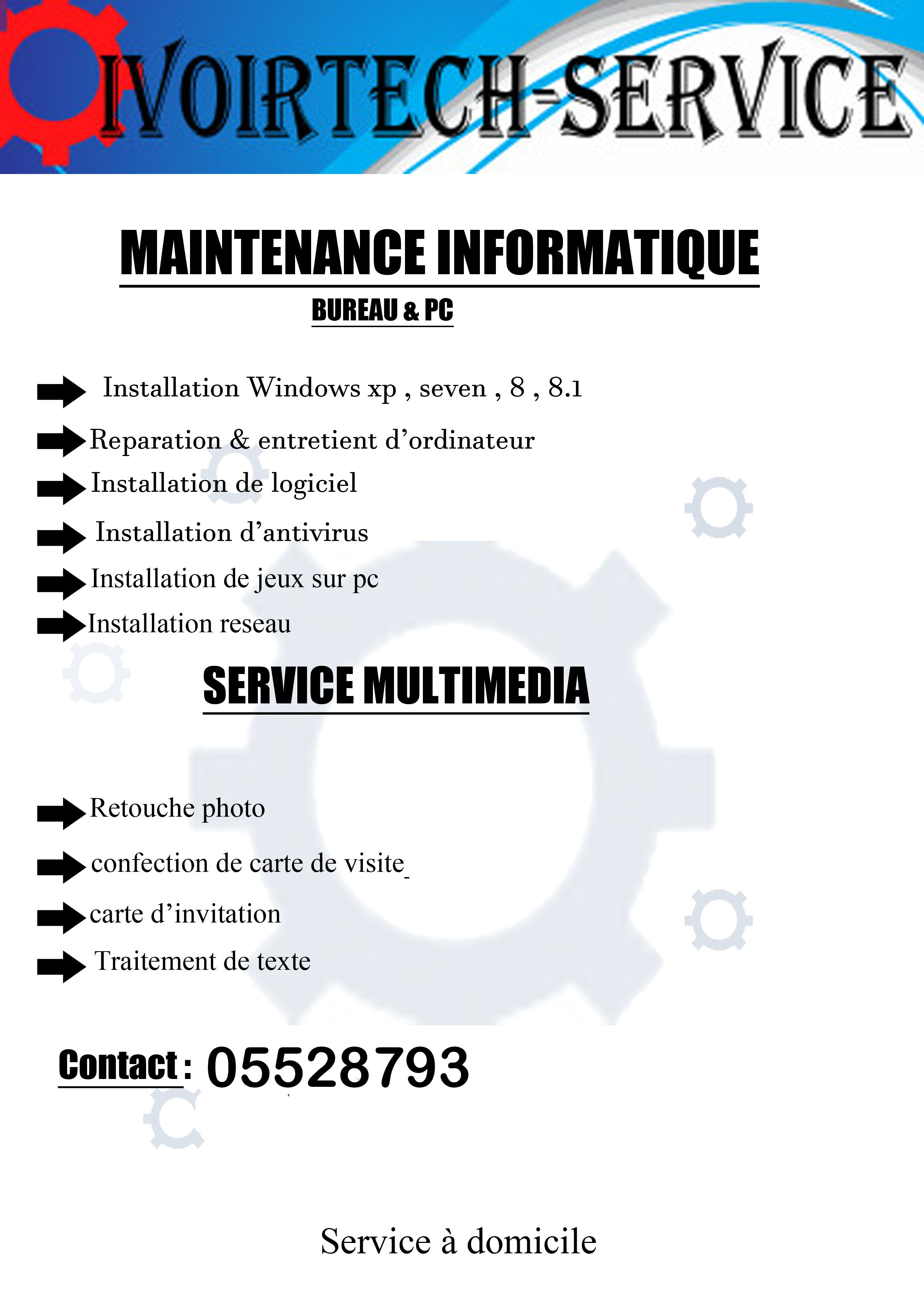 Particulier repart et entretien vos ordinateurs de bureau et ordinateurs portable • Installation de Windows XP /7/8/8.1/10 avec les pilotes complets et d’autres logiciels • Réparation d’ordinateurs bureau et ordinateurs portable Contact 05528793
