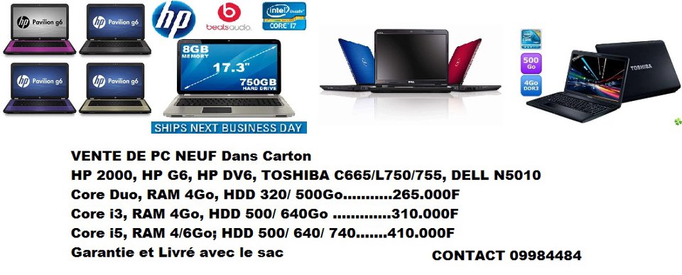 VENTE DE PC NEUF Dans CartonHP 2000, HP G6, HP DV6, TOSHIBA C665/L750Ll755, DELL N5010ACER ASPIRE 5733zCore Duo, RAM 4Go, HDD 320/ 500Go..................265.000FCore i3, RAM 4Go, HDD 500/ 640Go ....................310.000FCore i5, RAM 4/6Go; HDD 500/ 640/ 740Go..........400.000F...