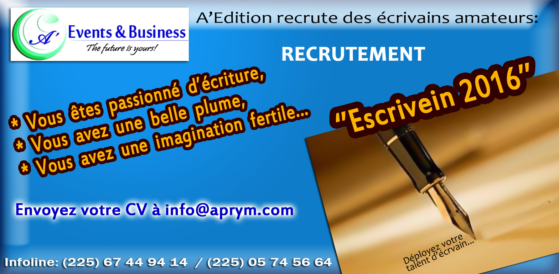 Le service Edition de A'Events & Business recrute pour formation d'un collège d'écrivain des écrivains amateurs. Etudiants, étudiantes en Lettres Modernes, Droit, Philosophie, Sociologie, Sciences Economiques, Théologie...et vous tous amoureux de l'écriture, saisissez l'opportuni...