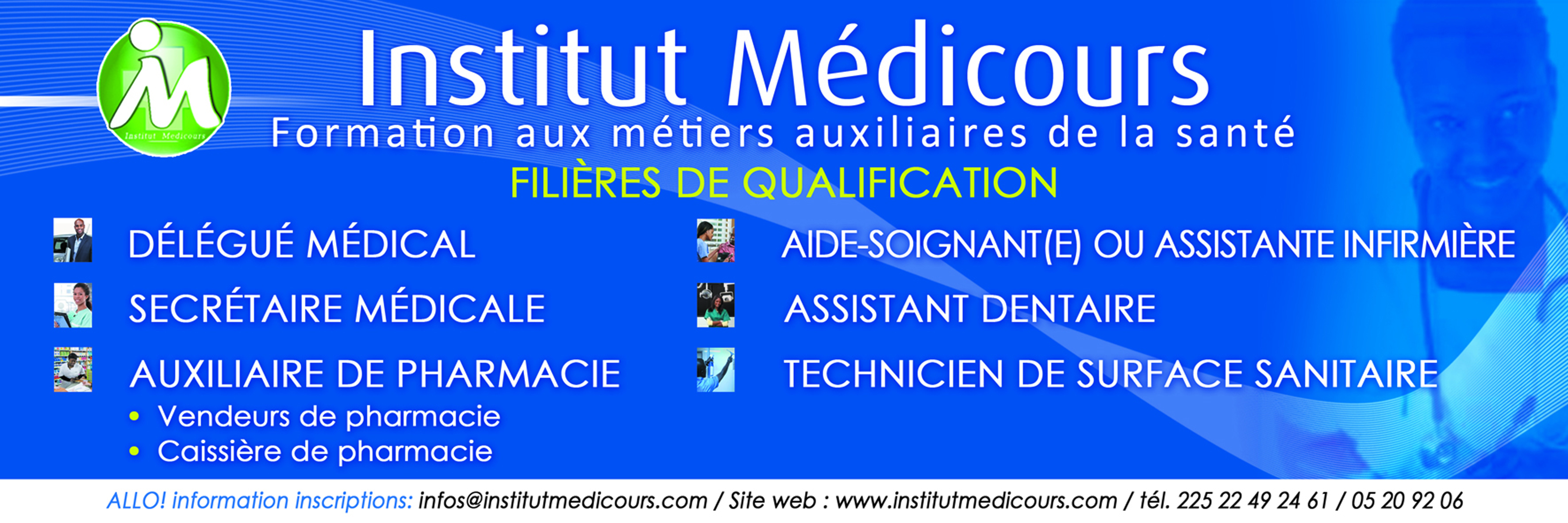 L'INSTITUT MEDICOURS , ÉTABLISSEMENT DE RÉFÉRENCE DANS LE DOMAINE MÉDICAL VOUS OFFRE DES FORMATIONS DANS LES DOMAINES SUIVANTS: - DÉLÉGUÉ MÉDICALE -DÉLÉGUÉ PHARMACEUTIQUE -AUXILIAIRE EN PHARMACIE -SECRÉTAIRE MÉDICALE - CAISSIÈRE EN PHARMACIE -AIDE SOIGNANT(e) NB : PRIS...