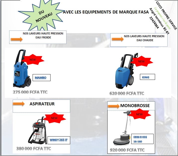 nous vous offrons des équipement de nettoyage haute pression eau froide et eau chaude ainsi que ds aspirateurs et des mono brosses à ds pris imbattable .pour tous renseignements contactez nous au 22 42 43 64 /03 73 81 94