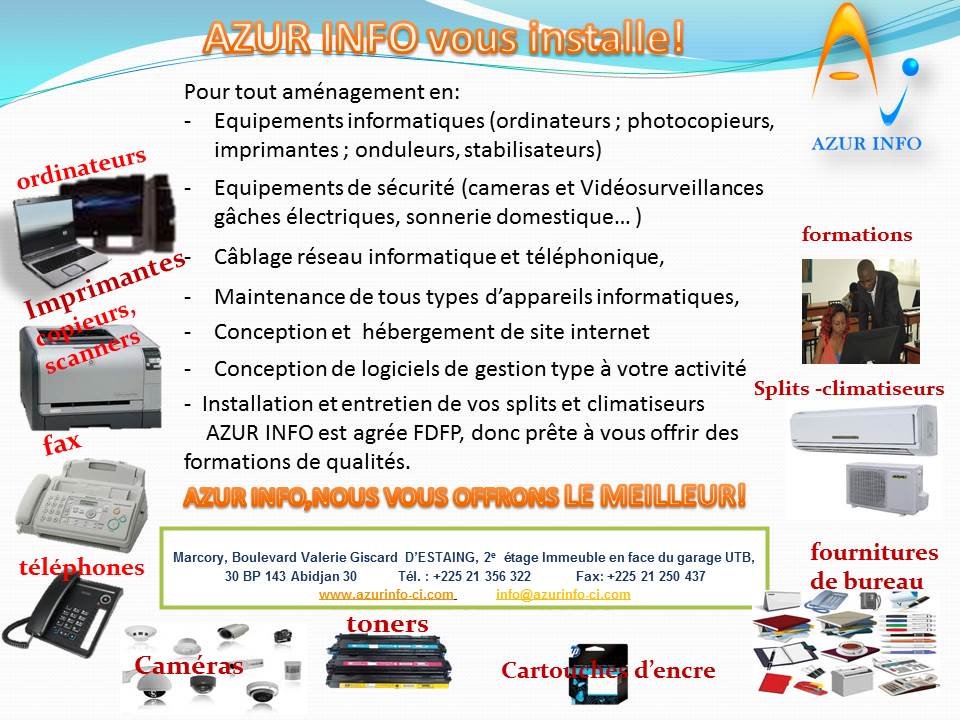 Pour tout aménagement en: -Equipements informatiques (ordinateurs , photocopieurs, imprimantes , onduleurs, stabilisateurs) -Equipements de sécurité (cameras et Vidéosurveillances gâches électriques, sonnerie domestique… ) - -Câblage réseau inform...
