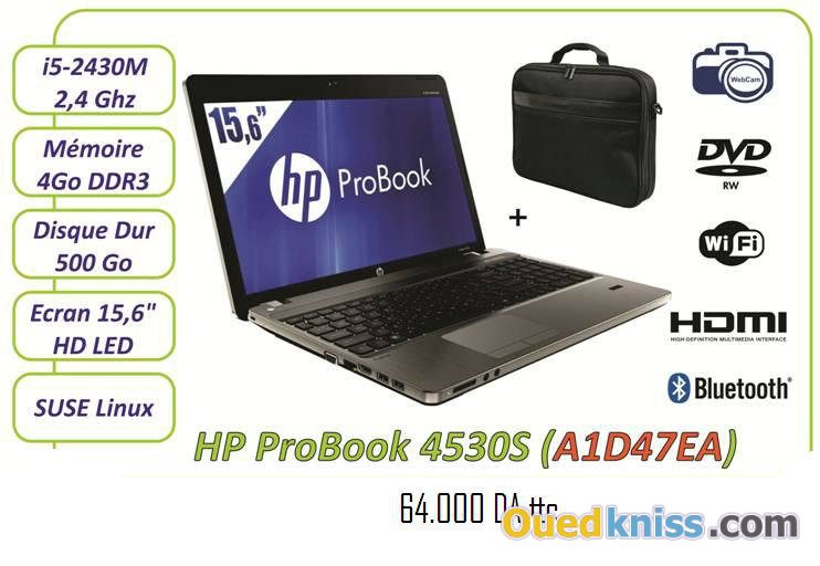 VENTE D'ORDINATEUR PORTABLE NEUF decompressé: HP PROBOOK 4530S Corei5Processeur: Intel Core i5, 2.40Ghz RAM 4Go, HDD 500GoÈcran: 15.6 pouces, WIFI, WEBCAM, LECTEUR DVDRW GRAVEURCLAVIER AZERTY + PAVE NUMERIQUE,SYSTEME D'EXPLOITATION : Microsoft Windows 7 HP 64 bits, AUTONOMIE +3h,...