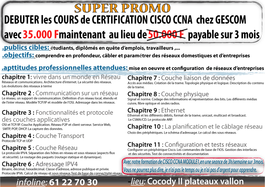 DEBUTER les COURS de CERTIFICATION CISCO CCNA chez GESCOM avec 35.000 Fmaintenant au lieu de 50.000 F payable sur 3 mois
