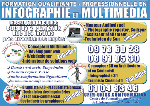 CFIM-UNISS.COMFORMATION - CENTRE DE FORMATION AUX METIERS DE L’INFOGRAPHIE ET DES MULTIMEDIA VOUS PROPOSE DES FORMATIONS SUIVANTES : MODULE 1- PAO (PUBLICATION ASSISTEE PAR ORDINATEUR) DÉBOUCHÉS: Graphiste PAO - Maquettiste presse -Technicien d’imprimerie (Opérateur signalétiqu...