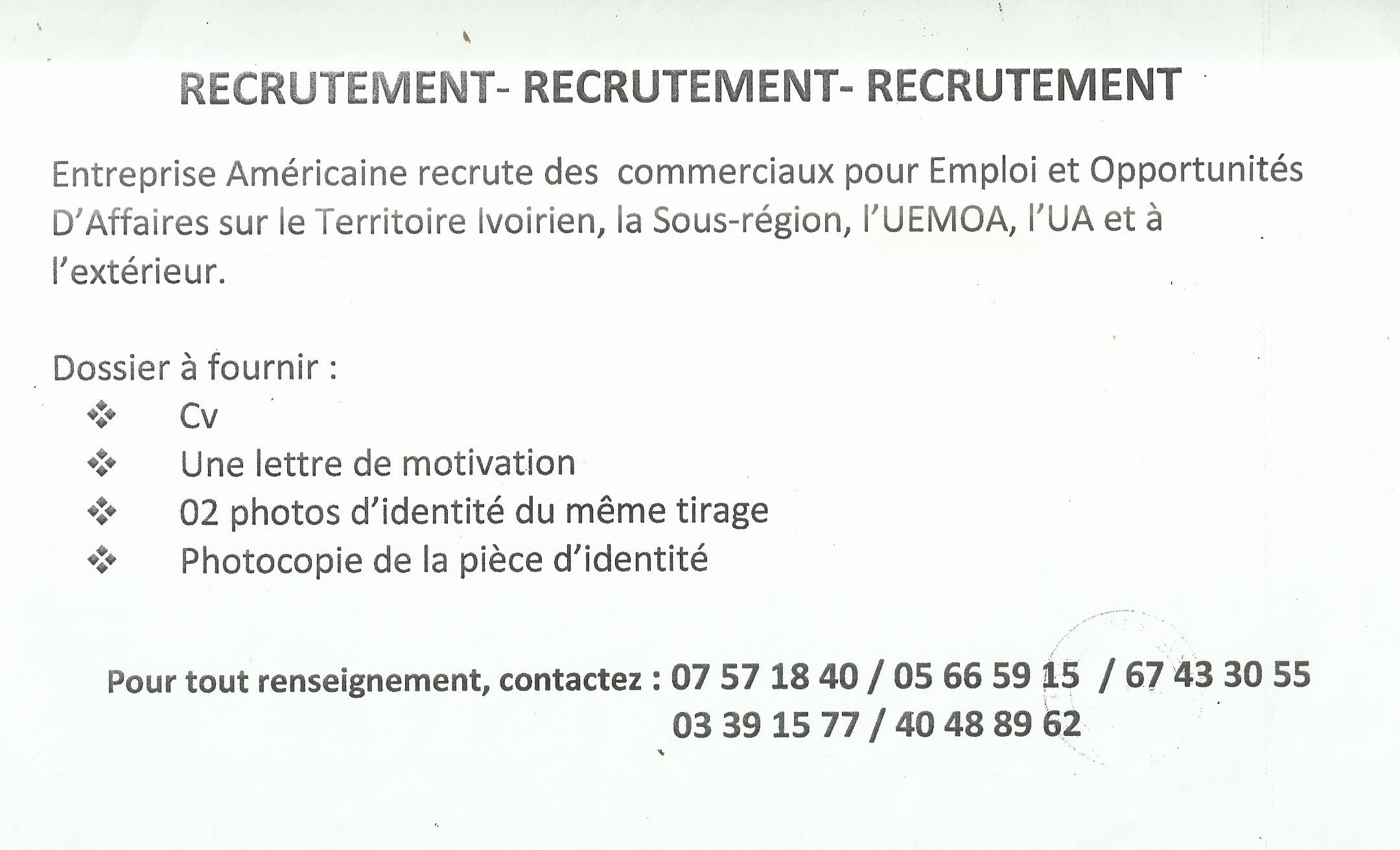 Nous recherchons 5 commerciales ( filles de preferences) pour la promotion d'un salon de beaute sis a treichville. Profil: etudiante, ou etre titulaire du bac, bac+1 et bac+2. Prime : jusqu'a 80 000f en fonction du rendement. Duree: 01 mois date limite, vendredi 04 avril 201...