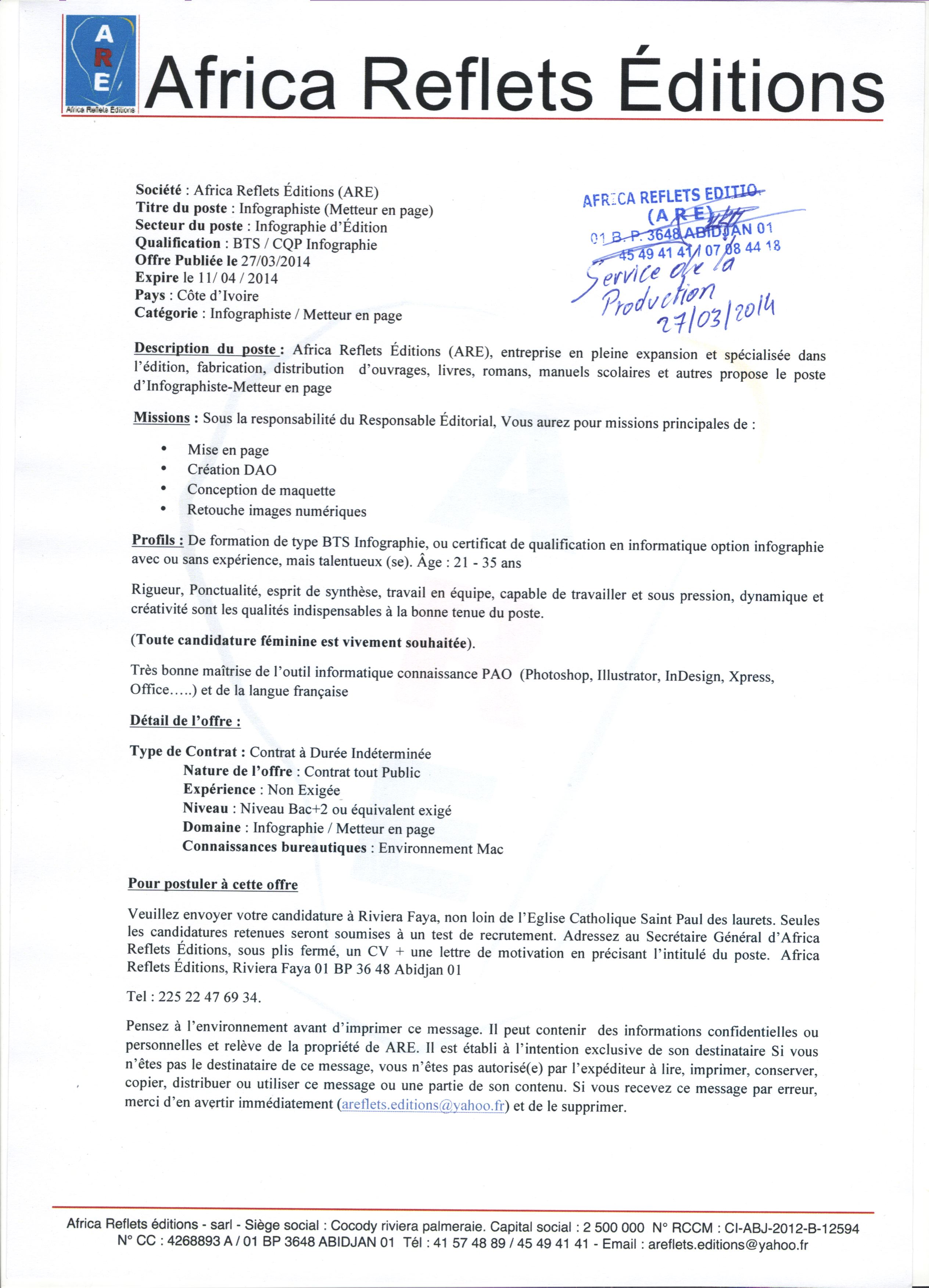 Africa Reflets Editions recrute une infographiste BTS/ CQP Infographie debut 27/03/2014 fin 11/04/2014 cdi