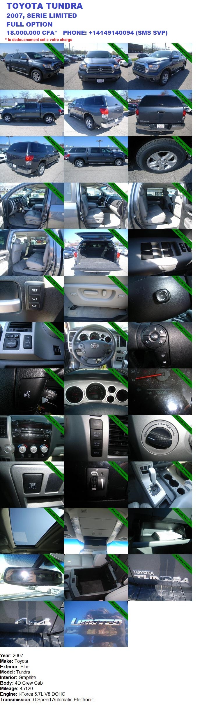 great business,le N 1 mondial de l auto vous presente sa tundra, ideal pour le job professionel. la puissance du moteur,la force de la tundra lui donne le rang d' honneur.si elle vous interesse ,envoyez- moi sms. 18 MILLIONS SANS DEDOUANEMENTDOYIB@LIVE.FR