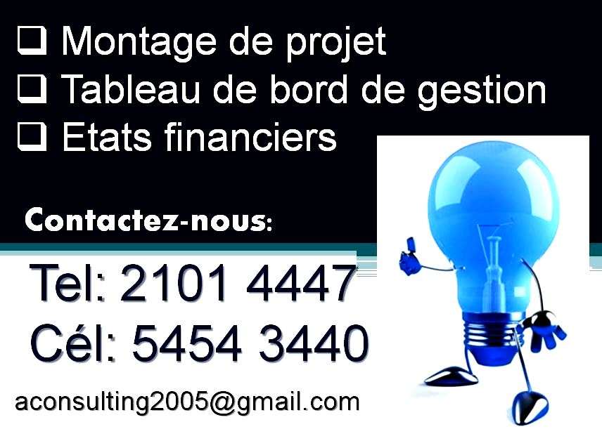 Pour la réalisation de votre business plan, bilan comptable, tableau de bord de gestion...contactez-nous. Une équipe d'experts se tient à votre disposition. Tél: 2101 4447 / 5454 3440 E-mail: aconsulting2005@gmail.com
