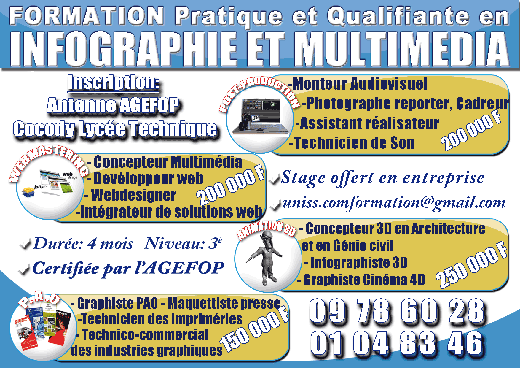 SE FORMER C'EST SE PREPARER A RELEVER LE DEFI DE DEMAIN. REJOIGNEZ NOUS A SBS POUR VOTRE PERFECTIONNEMENT DANS UN CADRE AGREABLE plus d'info www.sbs-ci.net contacts: 20 38 36 56 / 07 89 66 23 - RESEAUX INFORMATIQUES -DEVELOPPEMENT WEB et autres