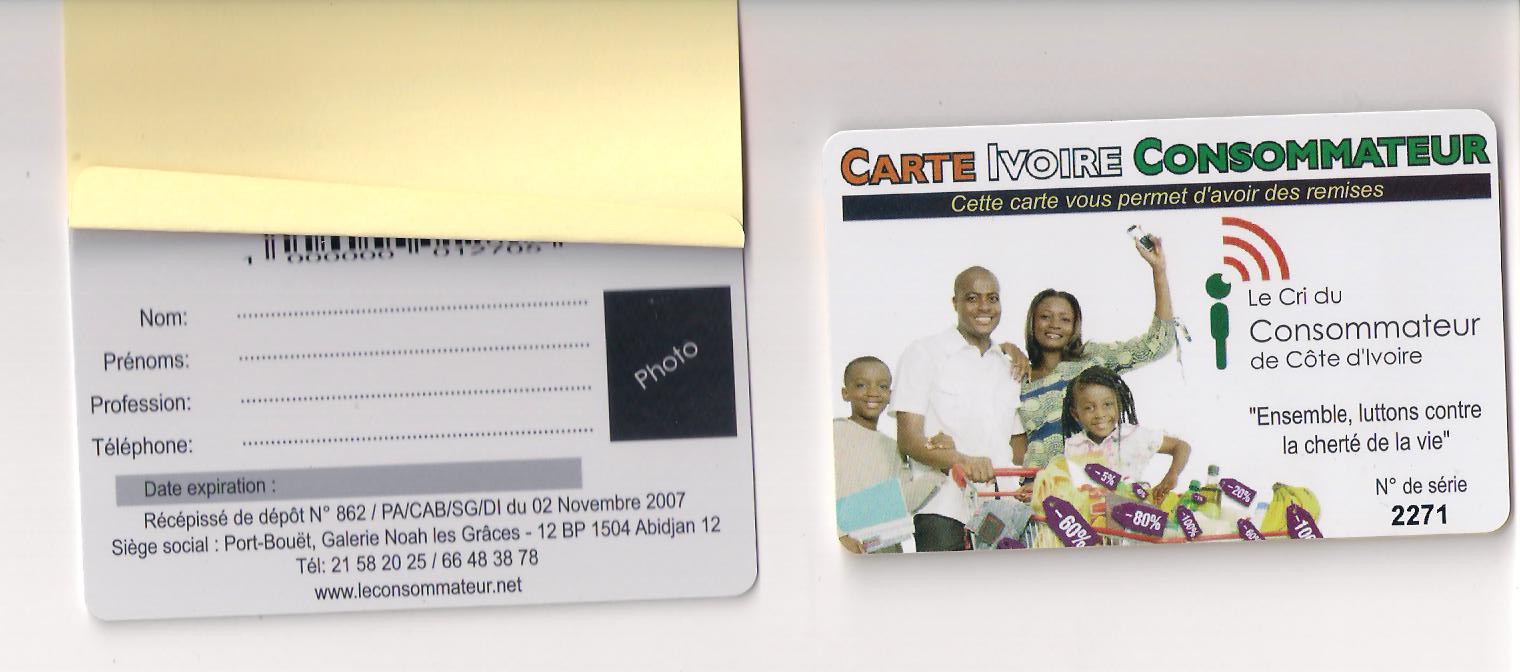 Obtenez votre CARTE IVOIRE CONSOMMATEUR à seulement 5000f et bénéficiez de réductions dans +de 300 magasins pendant 1an: ORCA DECO, SICOMEX, Chez FADY, MODERNE OPTIQUE, ABATTOIR de Port-Bouet, LIBRAIRIE DE FRANCE, PHARMACIES, etc, etc, etc Un produit de l'ONG LE CRI DU C...