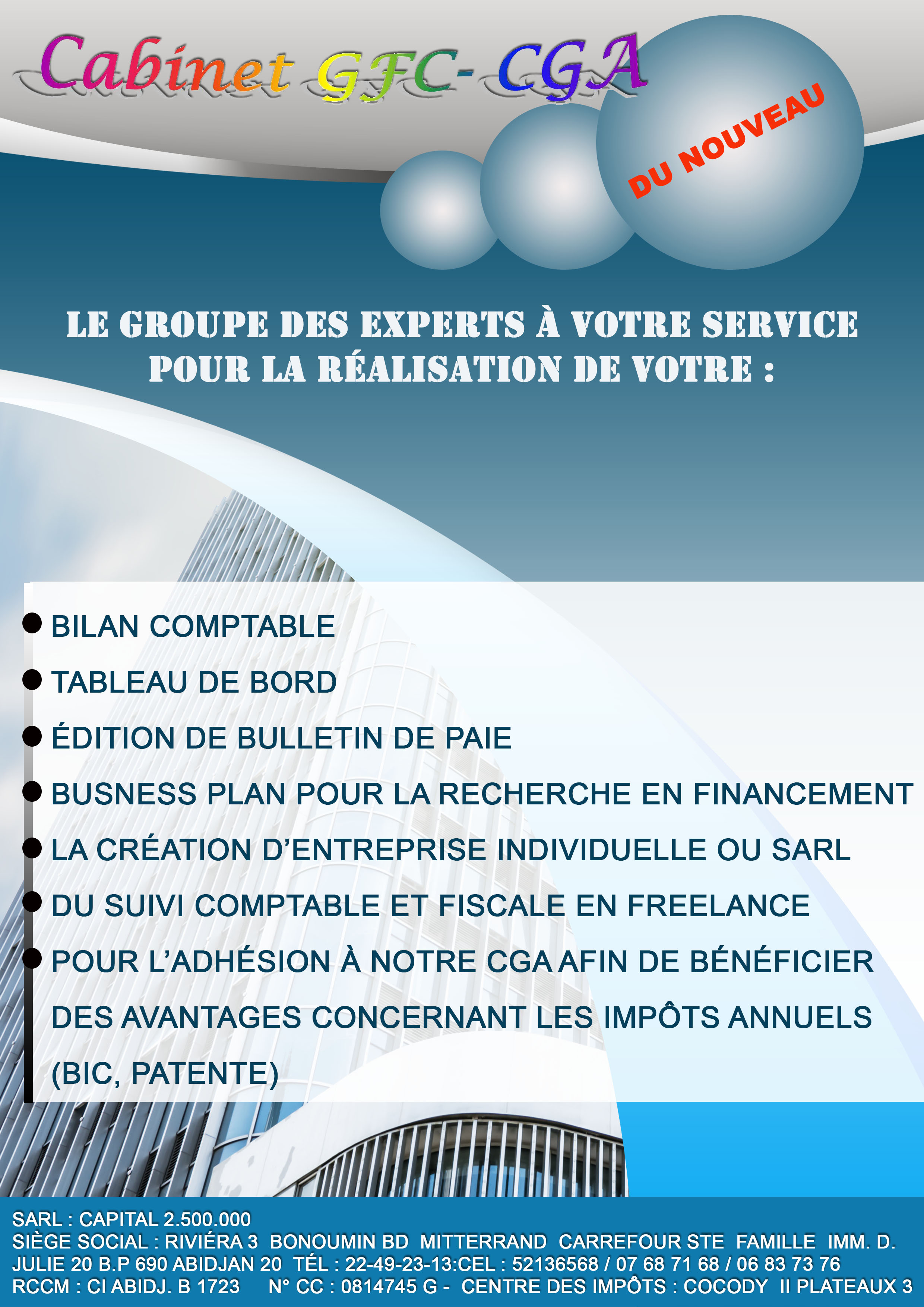 POUR LA RÉALISATION DE VOS ETATS FINANCIERS, BUSINESS PLAN, TABLEAU DE BORD DE GESTION, STAGE SUIVI DE SON RAPPORT, LA CRÉATION D’UNE ENTREPRISE INDIVIDUELLE OU SARL ET TOUTES ACTIVITÉS EN RAPPORT AVEC LA FINANCE OU LA COMPTABILITÉ….CONTACTEZ LE CABINET GFC...