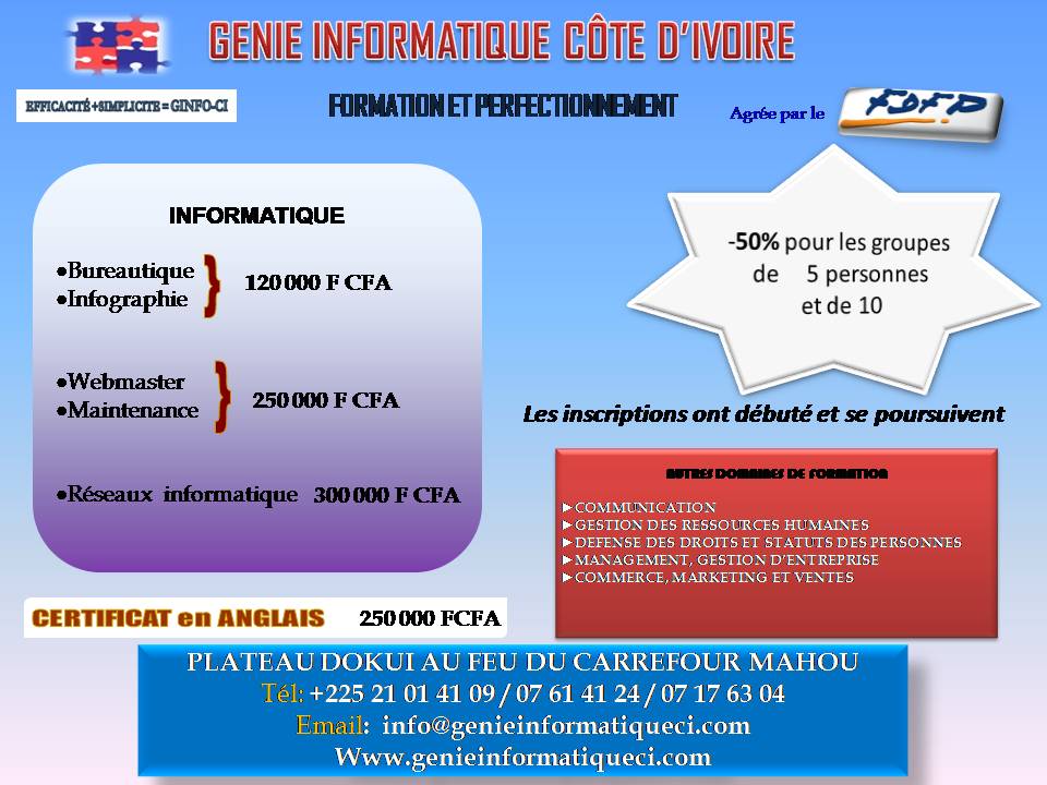 Agrée FDFP 1) Bureautique-Infographie-Développement Web- Maintenance Informatique-Infrastructures réseaux 2) Communication 3) Gestion des Ressources Humaines 4) Défense des droits et statuts des personnes 5) Commerce, Marketing et Ventes 6) Management et Gestion d'entrep...