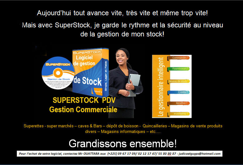 Le groupe future's Côte d'ivoire, spécialisé dans le développement de logiciels de gestion METIERS a le plaisir d'offrir 'SuperStock PDV' pour la gestion des : ü PME (Petites et Moyennes Entreprises) ü TPE (Très Petites Entreprises) ü Commerçants ü P...