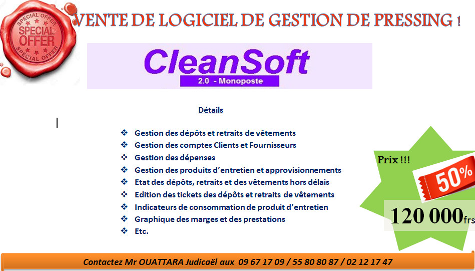Ce logiciel en vente est le votre.Il est simple, fiable, léger, pratique et surtout efficace. Avec cet utilitaire, c'est ''la gestion du pressing au bout des doigts'' donc recommandez le à vos proches tout en partageant cette image.May God bless each one and protect his life. ...