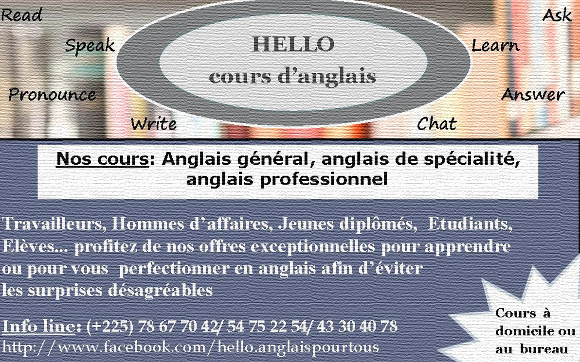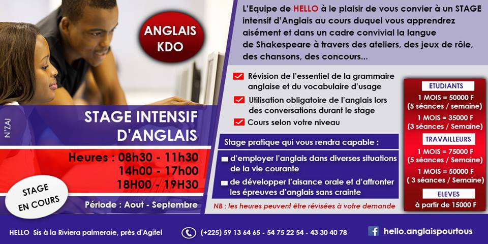 Hello. STAGE INTENSIF en ANGLAIS STAGE PRATIQUE VOUS PERMETTANT DE VOUS EXPRIMER CORRECTEMENT et RAPIDEMENT DANS TOUTES LES SITUATIONS DE LA VIE RÉELLE. Les cours organisés sous forme d'ateliers, de jeux de rôle ... permettront aux participants de se familiariser avec l'anglai...