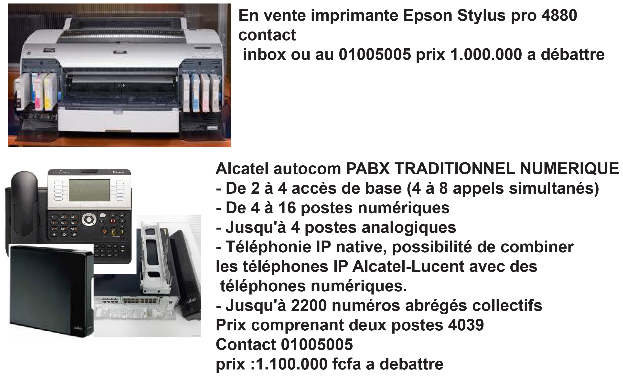 Cause double emploi, vend autocom PABX numérique. 4 à 8 appels simultanés. Téléphonie IP native. Jusqu'à 2200 appels abrégés collectifs. Vend Imprimante Epson Pro 4880 idéal pour les impressions numériques sur textiles, tasses, portes clés et tous supports gadgets publicitaires.