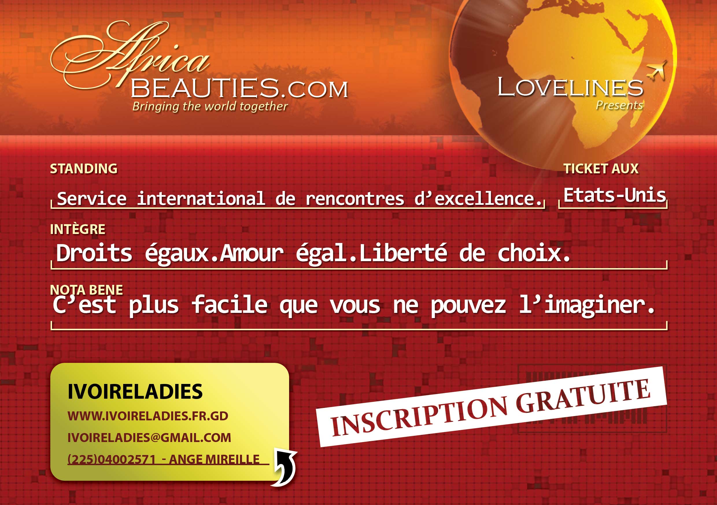 Mes demoiselles! La célèbre et importante agence matrimoniale internationale " africabeauties" basée aux USA a désormais une représentation locale en Côte d'ivoire. L’inscription est gratuite pour les femmes. pour vous inscrire ou inscrire quelqu'une veuillez nous contacter e...