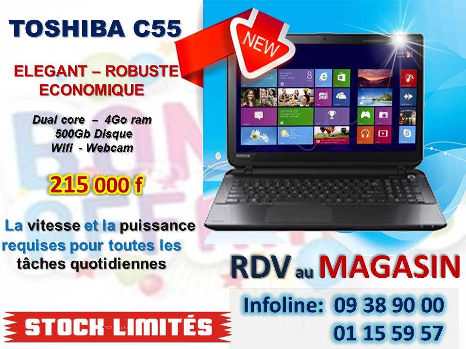 C'est le Moment de posséder 1 Ordinateur. Toshiba c55 dual core 2.16ghz Ram 4go - DD 500 Gb - wifi - webcam Prix 209.900 F au lieu de 215.000 F C'est simple et c'est malin' c'est uniquement chez Smart Choices. infoline : 09 38 90 00 ( appel ou sms) Stock limite a...