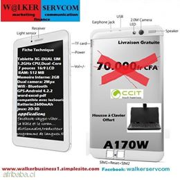 La tablette A170W dual sim 3G+ 4GB android passe de 70.000fca a 50.000fcfa contact 49 38 58 69/ 03 78 11 91