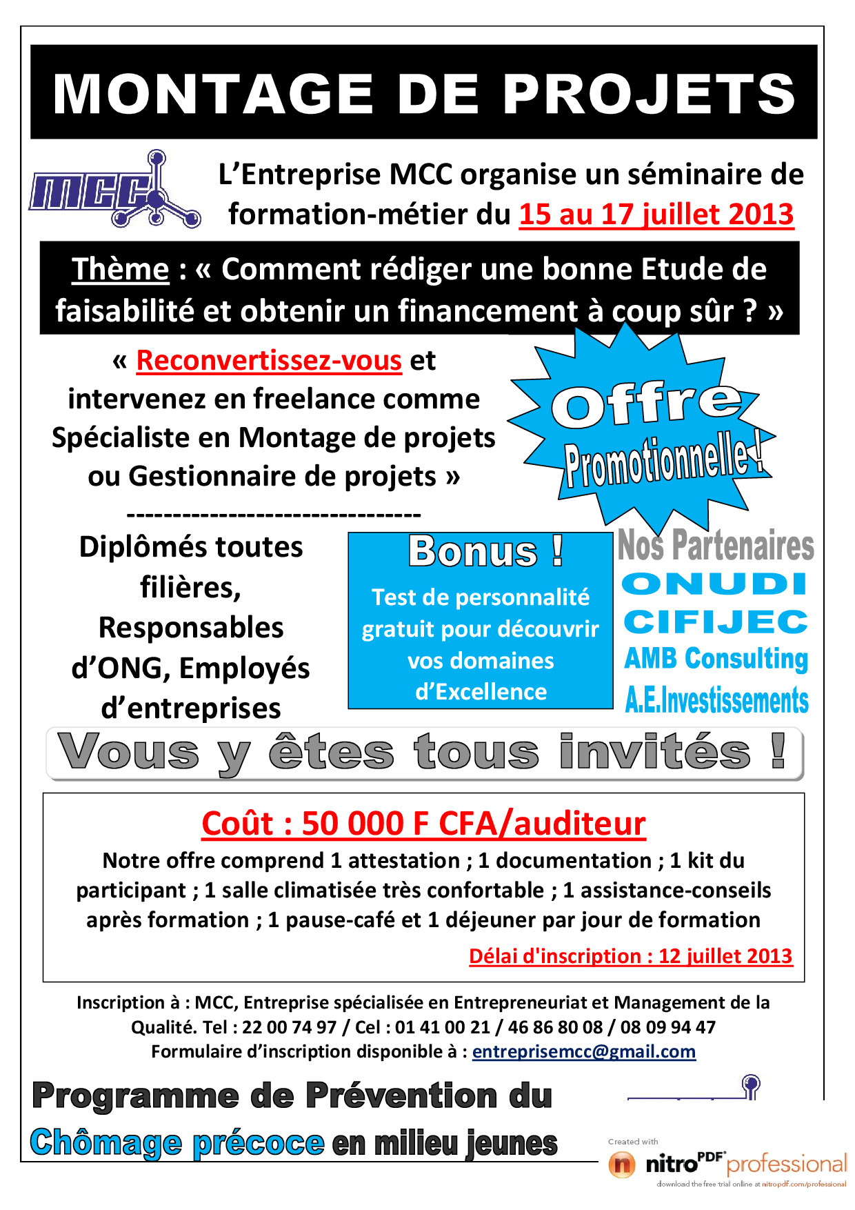 OFFRE PROMOTIONNELLE L’entreprise MCC organise un séminaire de formation-métier du 15 au 17 juillet 2013 THEME :> AVANTAGE : reconvertissez – vous et intervenez en freelance comme spécialiste en Montage de Projet ou Gestionnaire de projets...