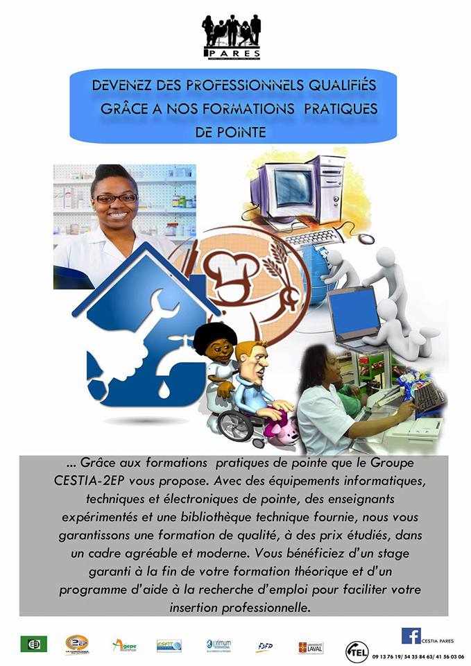 Grâce aux FORMATIONS QUALIFIANTES, pratiques de pointes que le Cabinet 2EP vous propose, obtenez le Certificat de Qualification Professionnelle en: Caisse spécialisée-Aide soignante- Auxiliaire en Pharmacie-Bureautique-Infographie-Maintenance informatique- Froid- Plomberie- Élect...