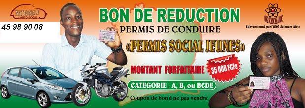 PROMO PERMIS DE CONDUIRE SUBVENTIONNE PAR ONG SCIENCE AFRIQUECatégories : A ; B ; BCE ; BCDEAge : 18 ans et plusLieu : COCODY CENTRE, 7ème TRANCHE, RIVIERA3 ; ABOBO ; MARCORYFrais d’inscription cours de code et conduite: 35000F CFAEnregistrement à la STARTEN : 26500F CFADroits d’...