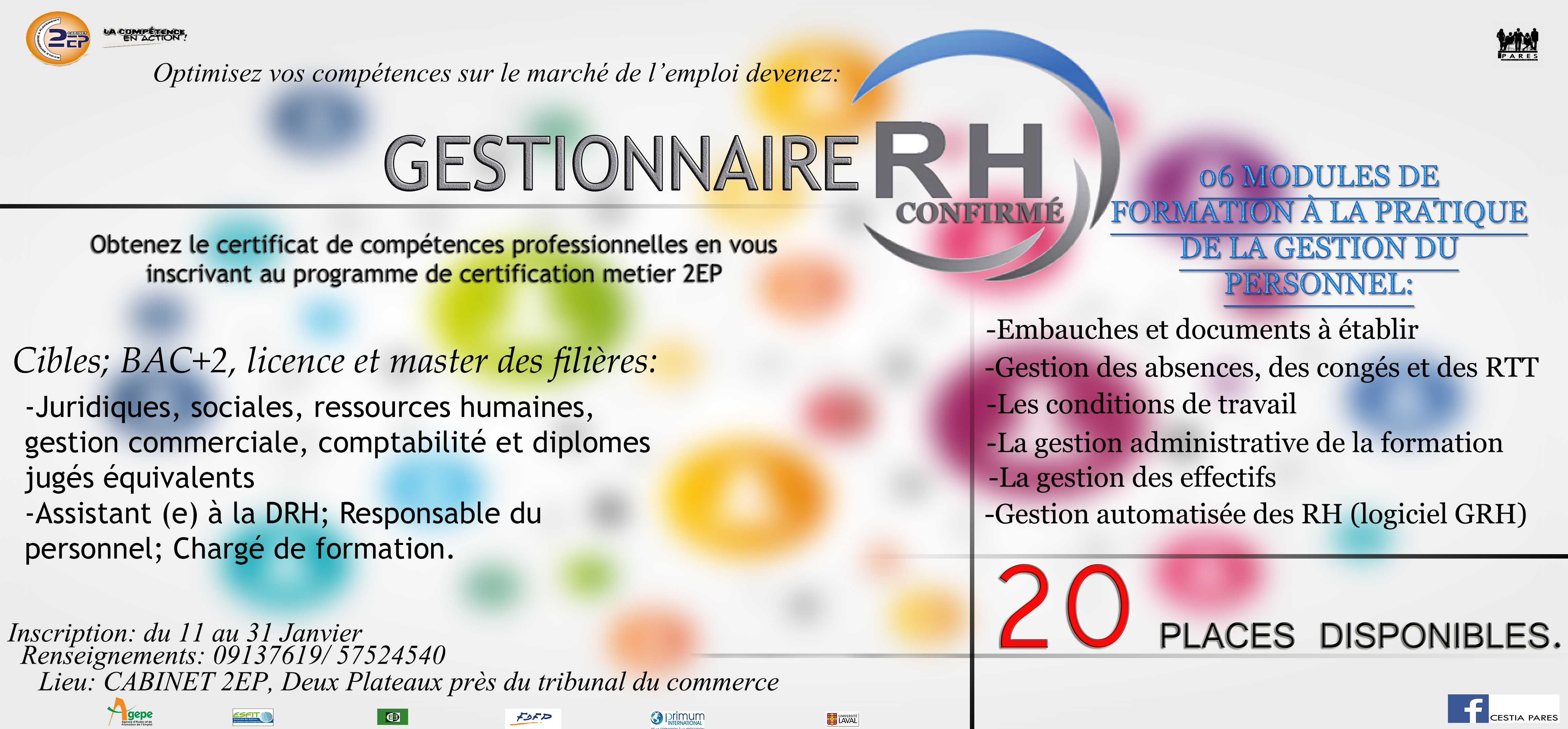 Cabinet spécialisé en formation professionnelle continue et placement, organise à UN PRIX IMBATTABLE, LA CERTIFICATION MÉTIER "DEVENIR GESTIONNAIRE DU PERSONNEL" , à partir du 06 février 2016. Les inscriptions sont ouvertes jusqu'au 30 janvier 2016, délai de rigue...